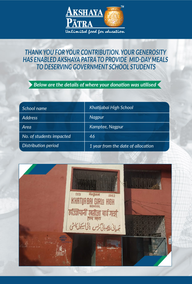 I am doing this campaign to raise awareness and funds for the Akshaya Patra Foundation. Funds raised would be used to provide wholesome school lunch to children in rural areas across Maharashtra (Mumbai, Thane, Vidarbha, etc.) under the Mid-day meal program.