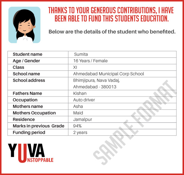 The cost of their education for an entire year is just INR 25000 per student. I am planning to raise INR 25000 and fund the education of one brilliant child for a year. The funds we raise go to YUVA UNSTOPPABLE which is a non-profit. Any funding you make will be eligible for 80G tax benefits.