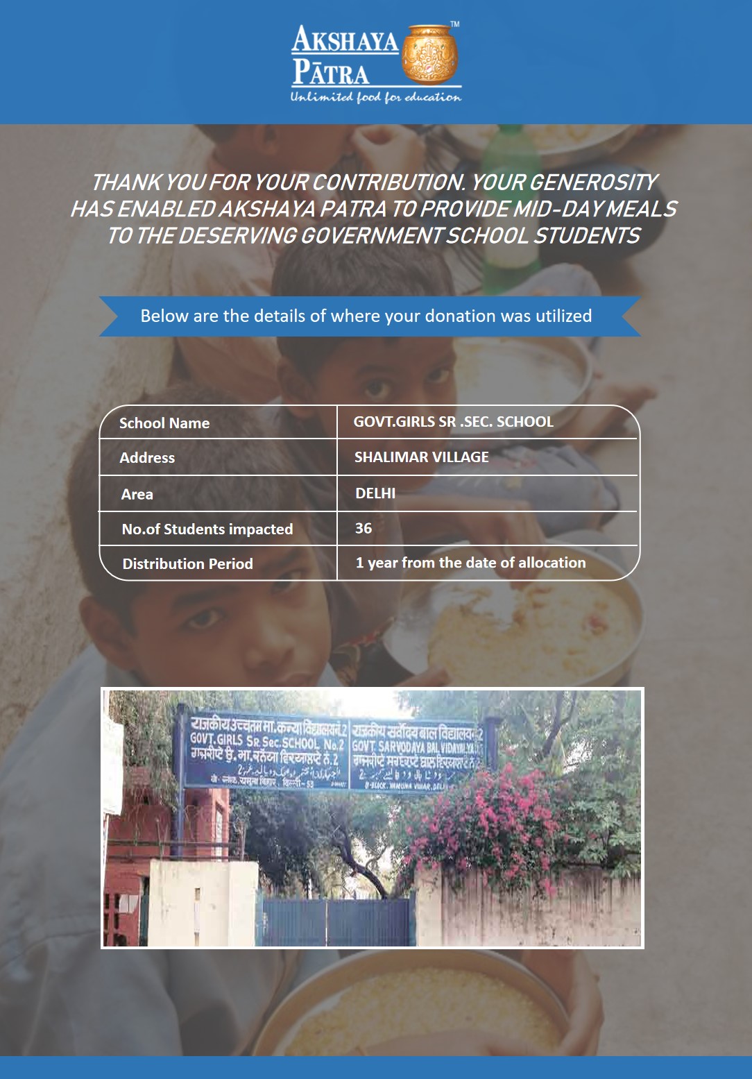 I am doing this campaign to raise awareness and funds for the Akshaya Patra Foundation. Funds raised would be used to provide wholesome school lunch to students studying at government schools across Delhi and UP under the Mid-day meal program.