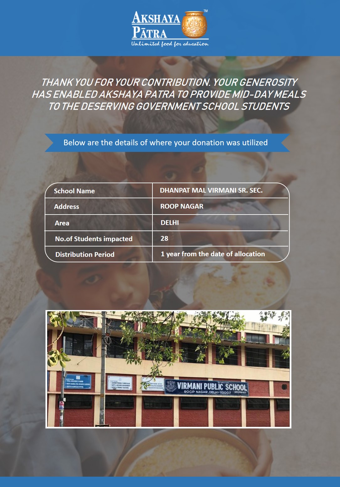 I am doing this campaign to raise awareness and funds for the Akshaya Patra Foundation. Funds raised would be used to provide wholesome school lunch to students studying at government schools across Delhi and UP under the Mid-day meal program.