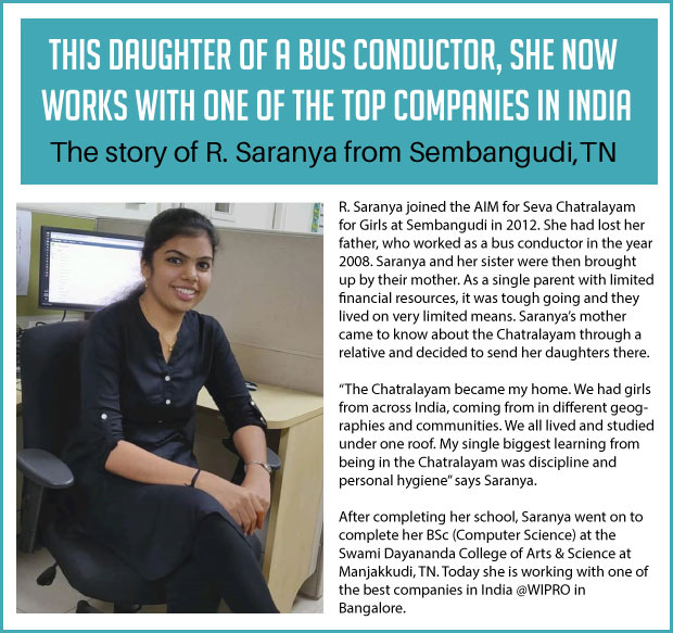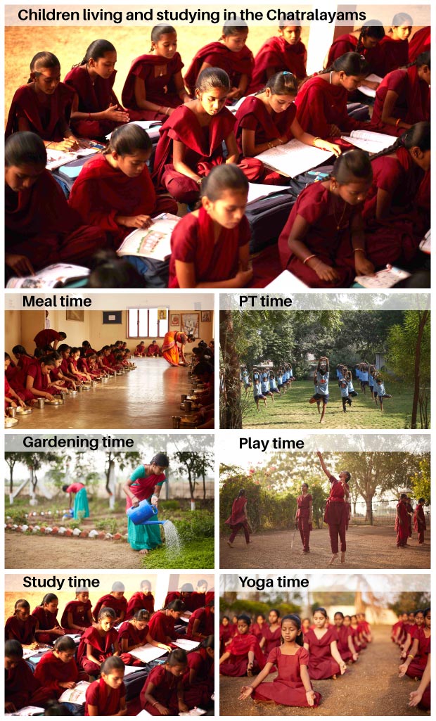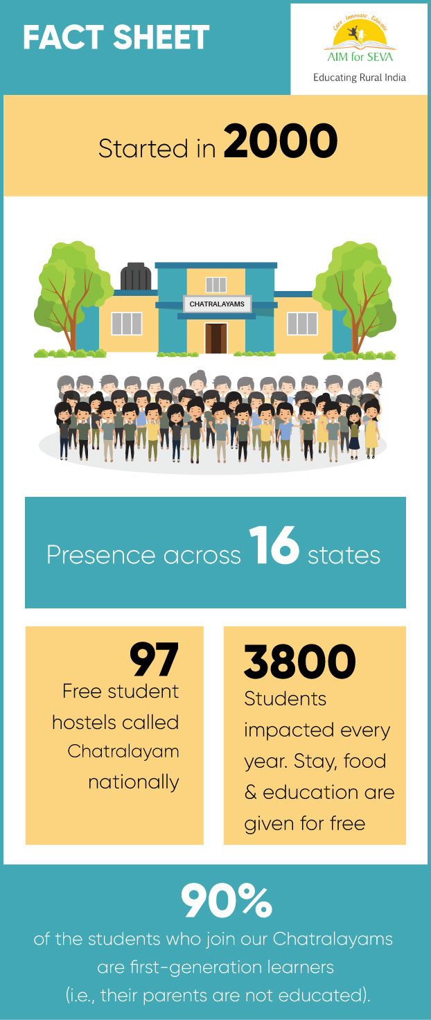 An NGO named AIM for Seva has built Chatralayams or free student hostels, where the children are provided with accommodation, food, uniforms, books, and school supplies – all for free. They attend a nearby school, and their studies at the school are also sponsored by AIM for Seva. The expenses per child come up to INR 36,000, of which education comes up to INR 10,000.