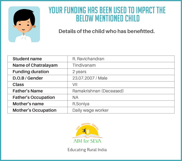 I have undertaken this campaign because I think being able to impact the life of a student in rural TN by helping to support their education for 2 full years would be incredible. Education is a powerful weapon that helps every one especially children from poor homes to get out of the vicious cycle of poverty. In the process not only the families get benefitted but also it leads to the upliftment of the society. These children live in hostels called CHATRALAYAMS. Their stay, food, and other costs are taken care off. This campaign of mine is to fund their education which costs INR 10000 per annum.