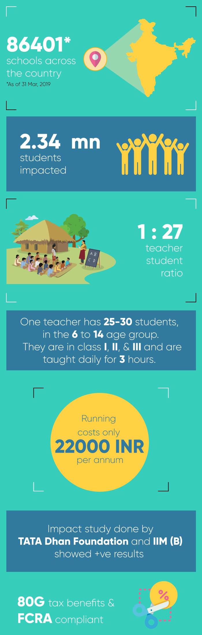 FACTS: For just INR 22000 you can fund the entire running of an Ekal Vidyalaya for a year. The Friends of Tribals Society (FTS) runs approx 86000 Ekal Vidyalaya schools across India under this wonderful program called EKAL ABHIYAN. This involves one teacher educating 30 kids for 3 hours every day for a year.