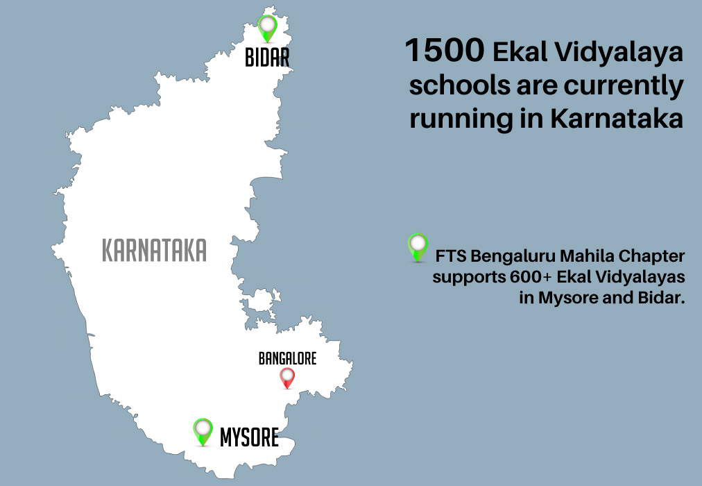 The Bangalore Mahila Chapter of FTS started in the year 2011. In Karnataka, FTS has almost 1500 schools with over 30000 children in the districts of Mysore, Chamrajanagar, Hassan, Chikmagalur, Gulbarga, Bidar, Bagalkot, Gangavathi, and Khanapur. FTS Bengaluru Mahila Chapter supports about 400 Ekal Vidyalayas in Karnataka with a focus on Mysore and Bidar.