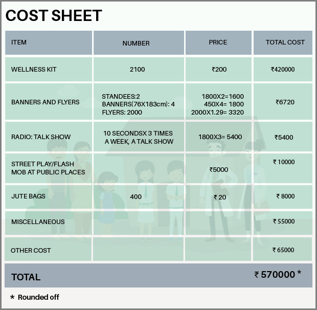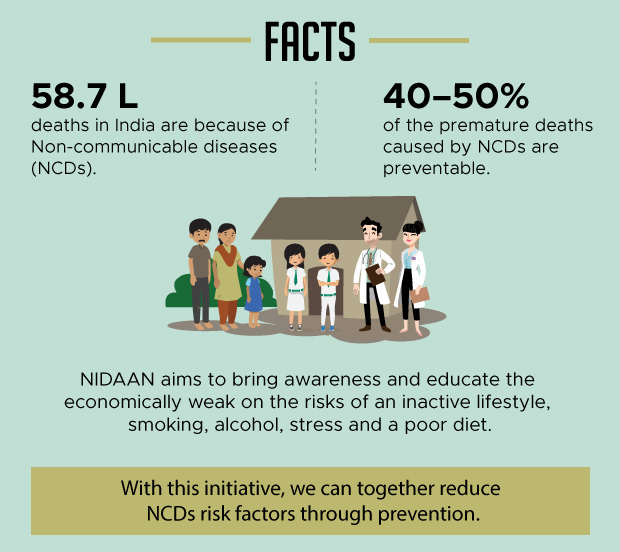 We are part of a team named NIDAAN and are working with a group of doctors from Pre2doc. The funds will also be used to do camps to spread awareness, give a wellness kit and do some innovative marketing through a Flash mob, a talk on AIR, a happy streets event organized by TOI and more. A detailed breakup of costs is given below. The wellness kit includes a toothbrush, toothpaste, inch tape, alcohol hand rub, comb, handsoap, hand towel, and a first-aid kit. The chief causes for NCDs are lack of exercise, poor diet, stress, alcohol, and smoking addiction. They account for and are the major cause of this. 40-50 percent of premature deaths that are caused by NCDs are preventable.
