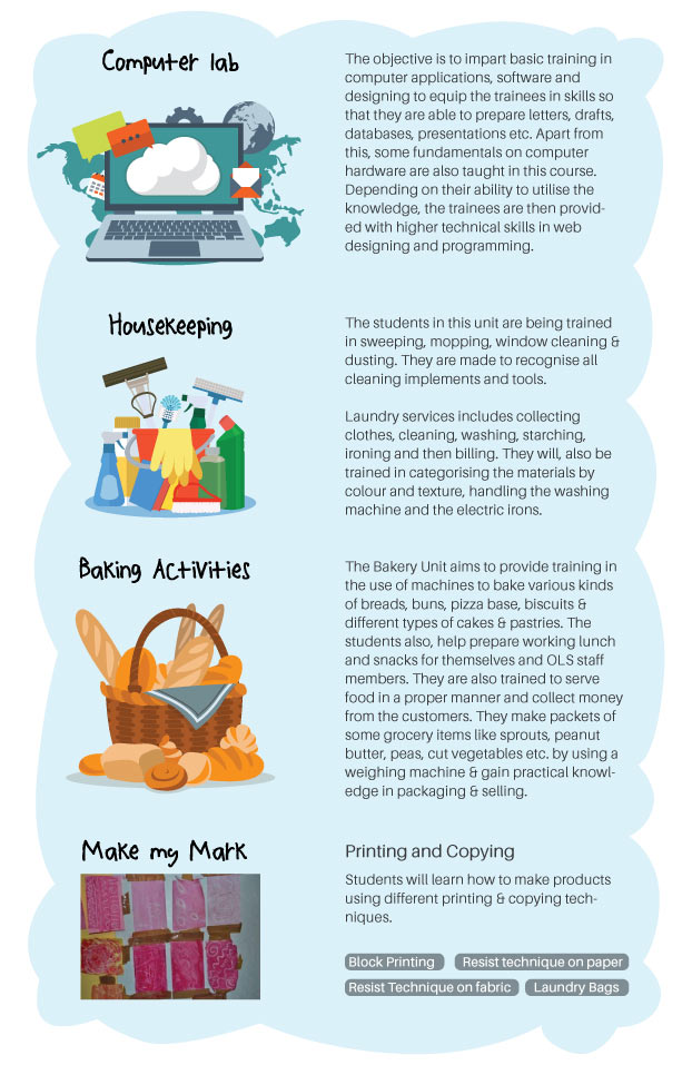 Pragati, a new initiative of the Biswa Gowri Charitable Trust is skill-based vocational training institute that aims at expanding horizons for individuals with Autism. It works out of a rented space where kids are trained on aspects of Computer technology, block printing, Bakery and Housekeeping. Their curriculum is designed keeping in mind the complexities of Autism and the things they can and can't do!