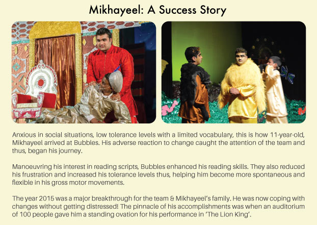 Bubbles Centre for Autism is a unit of Biswa Gouri Charitable Trust which provides educational programs for children with learning difficulties. The centre focusses on working with children in the Autism Spectrum and other neuro developmental disorders. This constitutes as school education for the kids who then graduate to Pragati.