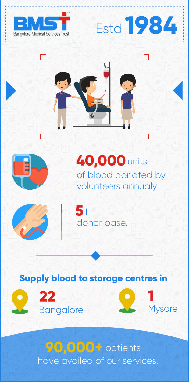Bangalore Medical Services Trust (BMST) is a not for profit Public Charitable Trust established by Rotary Club of Bangalore and TTK Group of Companies in 1984 to provide the blood banking services. The day-care transfusion facility that caters to Thalassemia patients has been in operation since 1991 and the control and prevention program was started in the year 2010.
