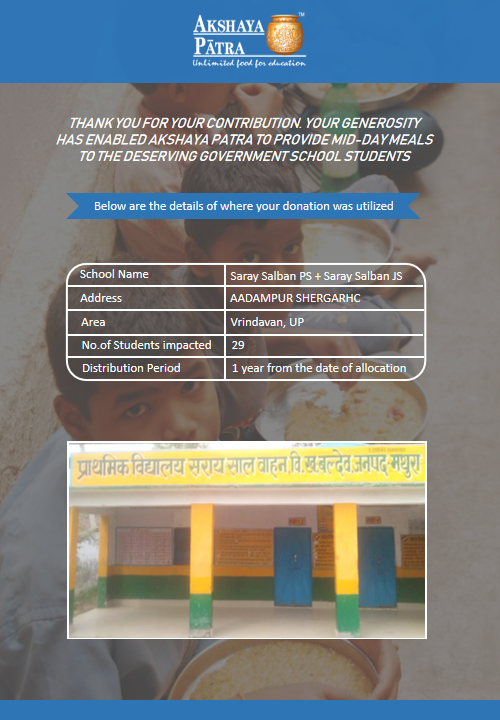 I am doing this campaign to raise awareness and funds for the Akshaya Patra Foundation. Funds raised would be used to provide wholesome school lunch to students studying at government schools across UP under the Mid-day meal program.