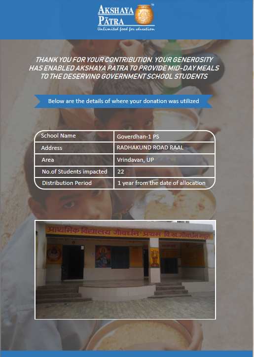 I am doing this campaign to raise awareness and funds for the Akshaya Patra Foundation. Funds raised would be used to provide wholesome school lunch to students studying at government schools across UP under the Mid-day meal program.