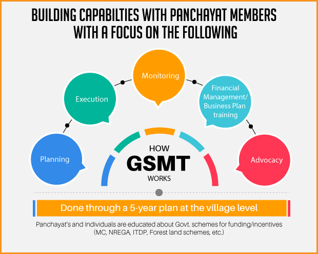 GSMT first and foremost strives to raise the awareness of the community to demand their Rights. This is followed by strengthening the capability of Gramsabha and Gram Panchayats for local self-governance. They have been provided handholding support to: