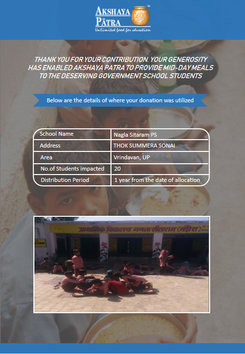 I am doing this campaign to raise awareness and funds for the Akshaya Patra Foundation. Funds raised would be used to provide wholesome school lunch to students studying at government schools across UP under the Mid-day meal program.