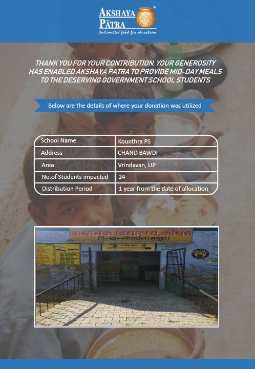 I am doing this campaign to raise awareness and funds for the Akshaya Patra Foundation. Funds raised would be used to provide wholesome school lunch to students studying at government schools across UP under the Mid-day meal program.