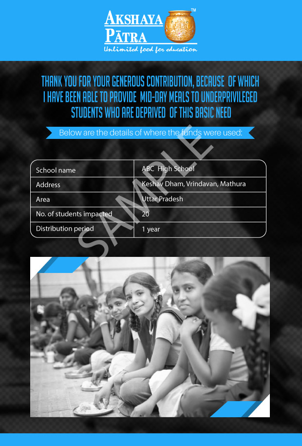 I am doing this campaign to raise awareness and funds for the Akshaya Patra Foundation. Funds raised would be used to provide wholesome school lunch to students studying at government schools across UP under the Mid-day meal program.