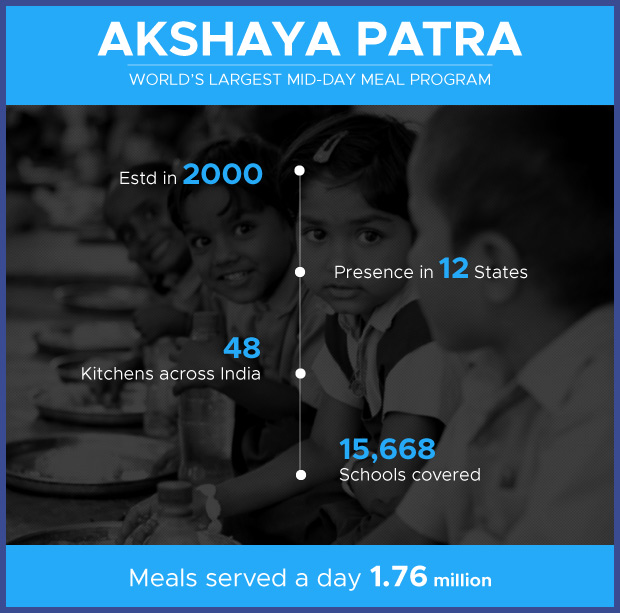 The Akshaya Patra Foundation is the World’s largest NGO-run Mid-Day meal program serving wholesome school lunch to over 1.76 mn children in 15024 schools across 12 states in India.