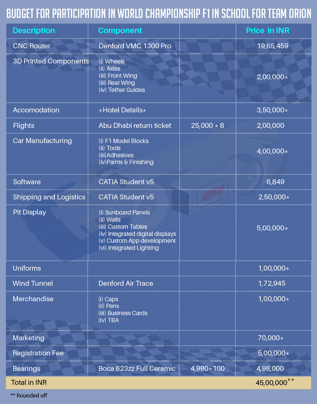 Team Orion Racing has made a budget of Rs 15.49 lacs for various activities. This includes procurement of 3D Printed Component, Car Manufacturing, Pit Display, Shipping and Logistics, Team Participation expenses, Software, and merchandise.