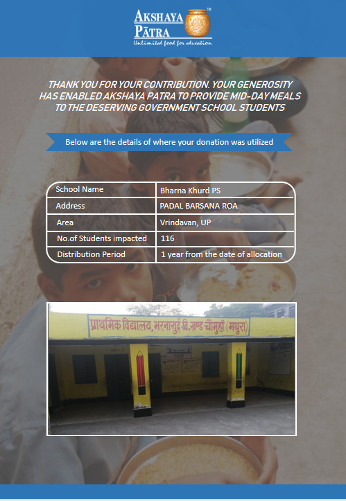 I am doing this campaign to raise awareness and funds for the Akshaya Patra Foundation. Funds raised would be used to provide wholesome school lunch to students studying at government schools across UP under the Mid-day meal program.