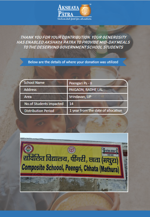 I am doing this campaign to raise awareness and funds for the Akshaya Patra Foundation. Funds raised would be used to provide wholesome school lunch to students studying at government schools across UP under the Mid-day meal program.