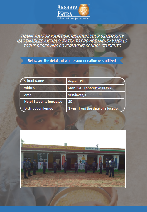 I am doing this campaign to raise awareness and funds for the Akshaya Patra Foundation. Funds raised would be used to provide wholesome school lunch to students studying at government schools across UP under the Mid-day meal program.
