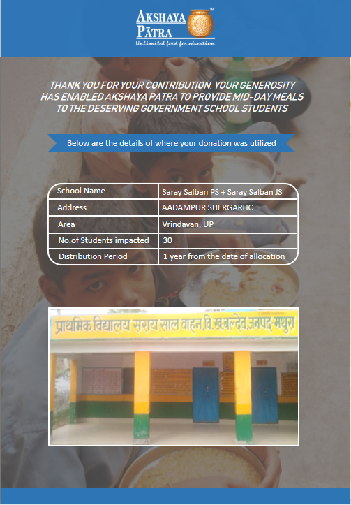 I am doing this campaign to raise awareness and funds for the Akshaya Patra Foundation. Funds raised would be used to provide wholesome school lunch to students studying at government schools across UP under the Mid-day meal program.