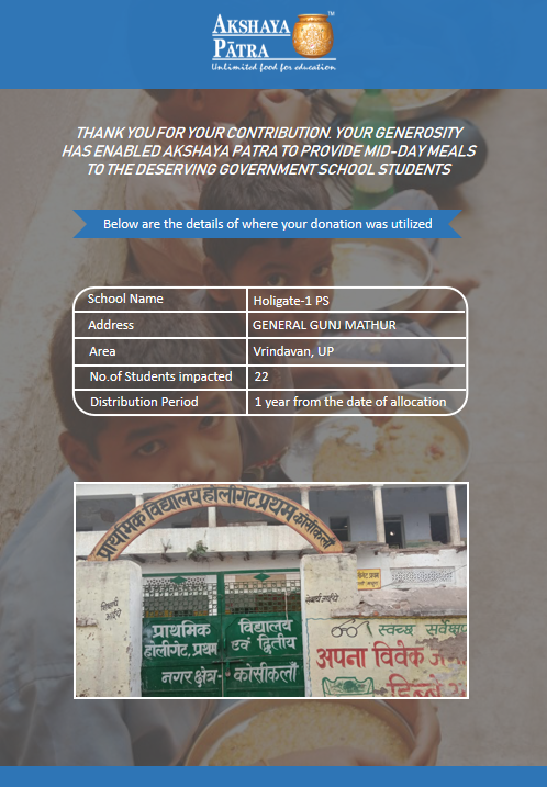 I am doing this campaign to raise awareness and funds for the Akshaya Patra Foundation. Funds raised would be used to provide wholesome school lunch to students studying at government schools across UP under the Mid-day meal program.