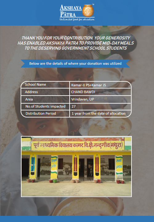I am doing this campaign to raise awareness and funds for the Akshaya Patra Foundation. Funds raised would be used to provide wholesome school lunch to students studying at government schools across UP under the Mid-day meal program.