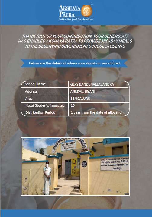 I am doing this campaign to raise awareness and funds for the Akshaya Patra Foundation. Funds raised would be used to provide wholesome school lunch to children in rural areas across Karnataka under the Mid-day meal program.