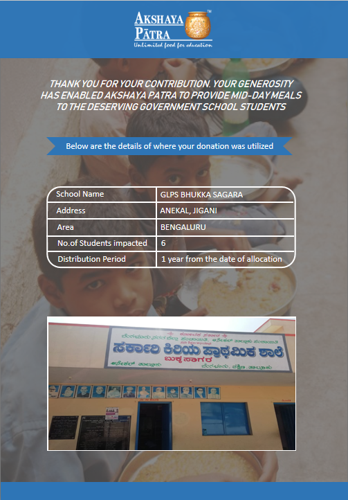 The Mid-day meal will be distributed to 452072 children in 2885 schools across 7 locations in Karnataka. We can provide mid-day meals for more students if we raise more funds. This will help bring more smiles and cheers to students and help us achieve the Foundation’s Vision that ‘’No child in India shall be deprived of Education, because of Hunger’’.