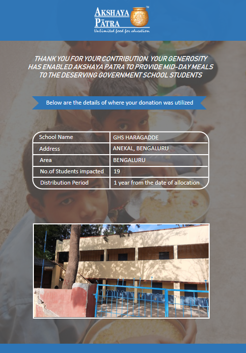 To ensure that there is complete transparency I shall get a report from NGO (this takes between 2 to 4 months usually after the funds are raised & transferred to them) telling me who benefitted from the funding. The details will then be posted from Akshaya Patra on the UPDATES section of my campaign. As soon as I post an update, the platform will send an SMS and EMAIL alert to all the funders - i.e. to you. Click on the link on the email and you can read about who benefitted. That's transparent right.