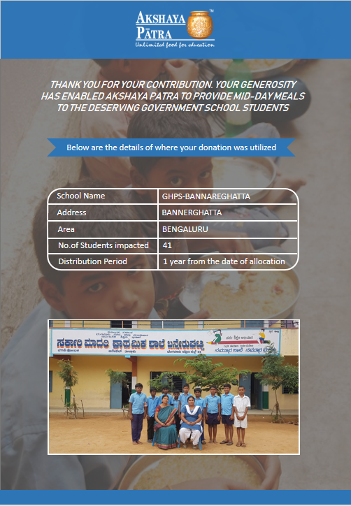 I am doing this campaign to raise awareness and funds for the Akshaya Patra Foundation. Funds raised would be used to provide wholesome school lunch to children in rural areas across Karnataka under the Mid-day meal program.