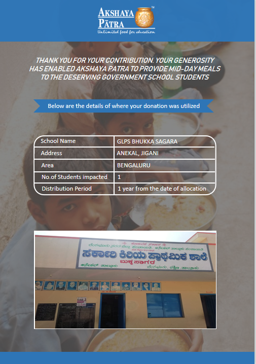I am doing this campaign to raise awareness and funds for the Akshaya Patra Foundation. Funds raised would be used to provide wholesome school lunch to children in rural areas across Karnataka under the Mid-day meal program.