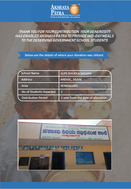 The Mid-day meal will be distributed to 452072 children in 2885 schools across 7 locations in Karnataka. We can provide mid-day meals for more students if we raise more funds. This will help bring more smiles and cheers to students and help us achieve the Foundation’s Vision that ‘’No child in India shall be deprived of Education, because of Hunger’’.