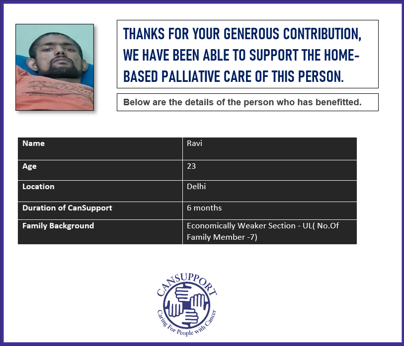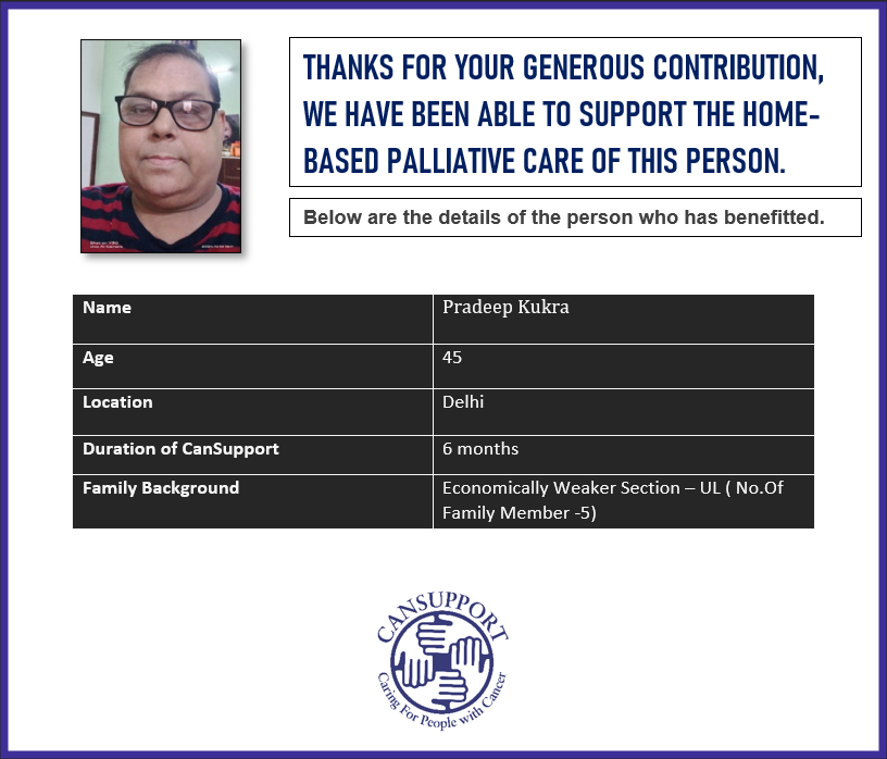 Please fund this campaign and together we can provide physical, emotional, psychosocial and financial support for cancer patients and their families. This campaign has 80-G tax benefits as the receipts are issued by CanSupport which is a non-profit.
