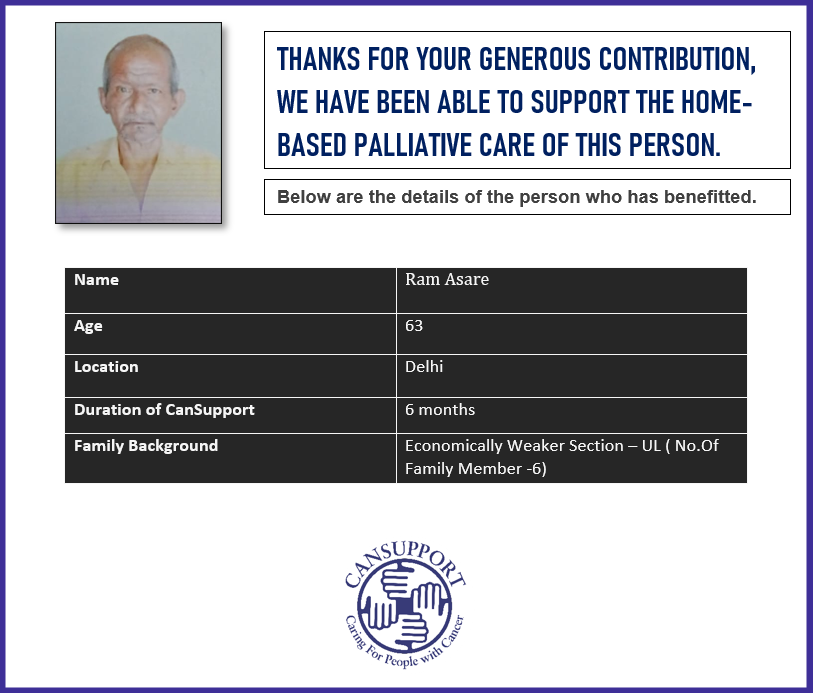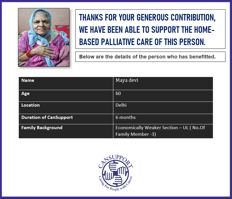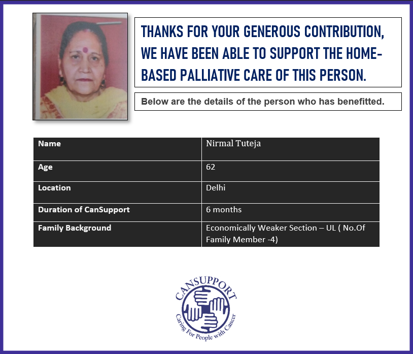 There are hundreds of patients like ASHA for whom a visit from a CanSupport person is a breath of fresh air. Together let's give comfort, care, and a better life to patients like ASHA. All of them will not recover from their cancer as in most cases it may be terminal. Please fund this campaign so that we can be a godsend to patients like ASHA.