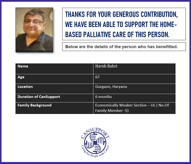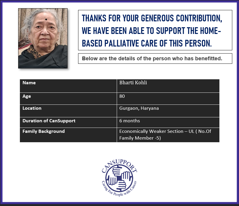 Please fund this campaign and together we can provide physical, emotional, psychosocial and financial support for cancer patients and their families. This campaign has 80-G tax benefits as the receipts are issued by CanSupport which is a non-profit.