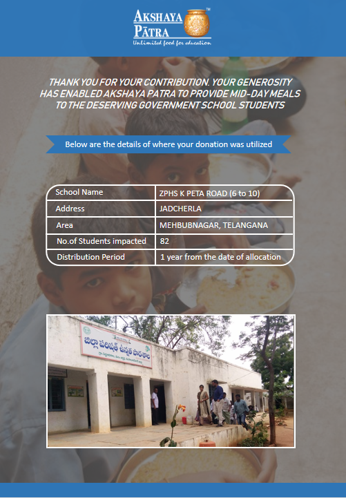 I am doing this campaign to raise awareness and funds for the Akshaya Patra Foundation. Funds raised would be used to provide wholesome school lunch to students studying at government schools across Telangana under the Mid-day meal program.