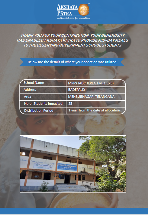 I am doing this campaign to raise awareness and funds for the Akshaya Patra Foundation. Funds raised would be used to provide wholesome school lunch to students studying at government schools across Telangana under the Mid-day meal program.