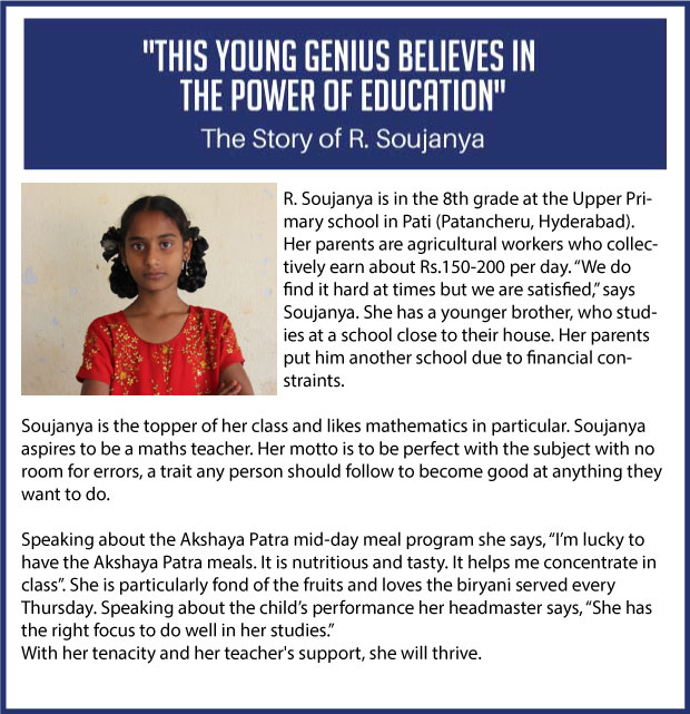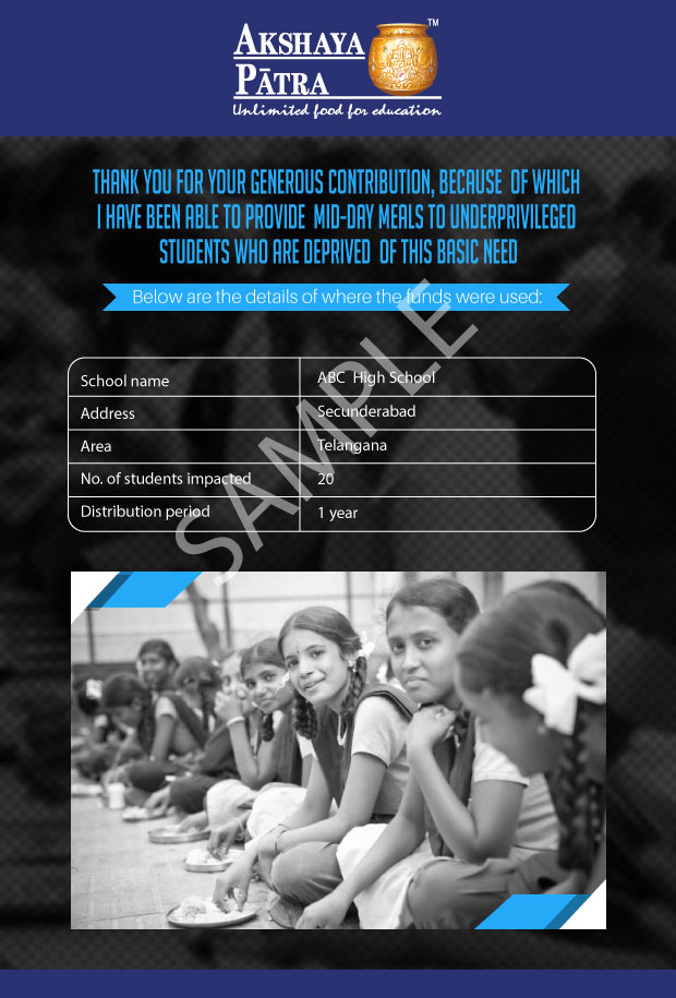 I am doing this campaign to raise awareness and funds for the Akshaya Patra Foundation. Funds raised would be used to provide wholesome school lunch to students studying at government schools across Telangana under the Mid-day meal program.