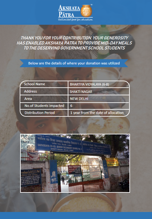 I am doing this campaign to raise awareness and funds for the Akshaya Patra Foundation. Funds raised would be used to provide wholesome school lunch to students studying at government schools across NCR and UP under the Mid-day meal program.