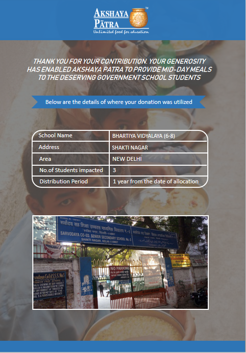 I am doing this campaign to raise awareness and funds for the Akshaya Patra Foundation. Funds raised would be used to provide wholesome school lunch to students studying at government schools across NCR and UP under the Mid-day meal program.