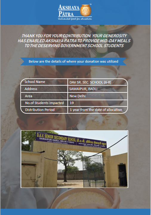 The Mid-day meal will be distributed across schools in NCR and UP. We can provide mid-day meals for more students if we raise more funds. This will help bring more smiles and cheers to students and help us achieve the Foundation’s vision that "No child in India shall be deprived of Education, because of Hunger".