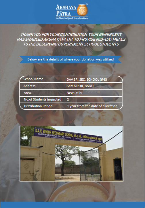 I am doing this campaign to raise awareness and funds for the Akshaya Patra Foundation. Funds raised would be used to provide wholesome school lunch to students studying at government schools across NCR and UP under the Mid-day meal program.
