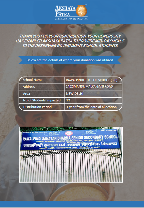 I am doing this campaign to raise awareness and funds for the Akshaya Patra Foundation. Funds raised would be used to provide wholesome school lunch to students studying at government schools across NCR and UP under the Mid-day meal program.