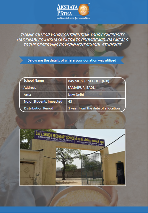 The Mid-day meal will be distributed across schools in NCR and UP. We can provide mid-day meals for more students if we raise more funds. This will help bring more smiles and cheers to students and help us achieve the Foundation’s vision that "No child in India shall be deprived of Education, because of Hunger".