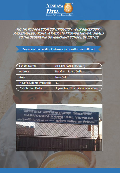 I am doing this campaign to raise awareness and funds for the Akshaya Patra Foundation. Funds raised would be used to provide wholesome school lunch to students studying at government schools across NCR and UP under the Mid-day meal program.