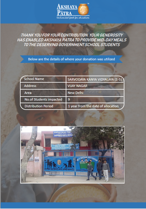 The Mid-day meal will be distributed across schools in NCR and UP. We can provide mid-day meals for more students if we raise more funds. This will help bring more smiles and cheers to students and help us achieve the Foundation’s vision that "No child in India shall be deprived of Education, because of Hunger".