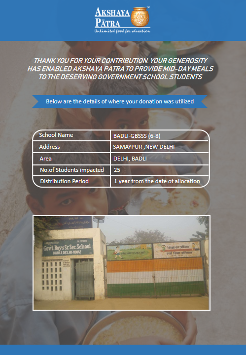 I am doing this campaign to raise awareness and funds for the Akshaya Patra Foundation. Funds raised would be used to provide wholesome school lunch to students studying at government schools across NCR and UP under the Mid-day meal program.