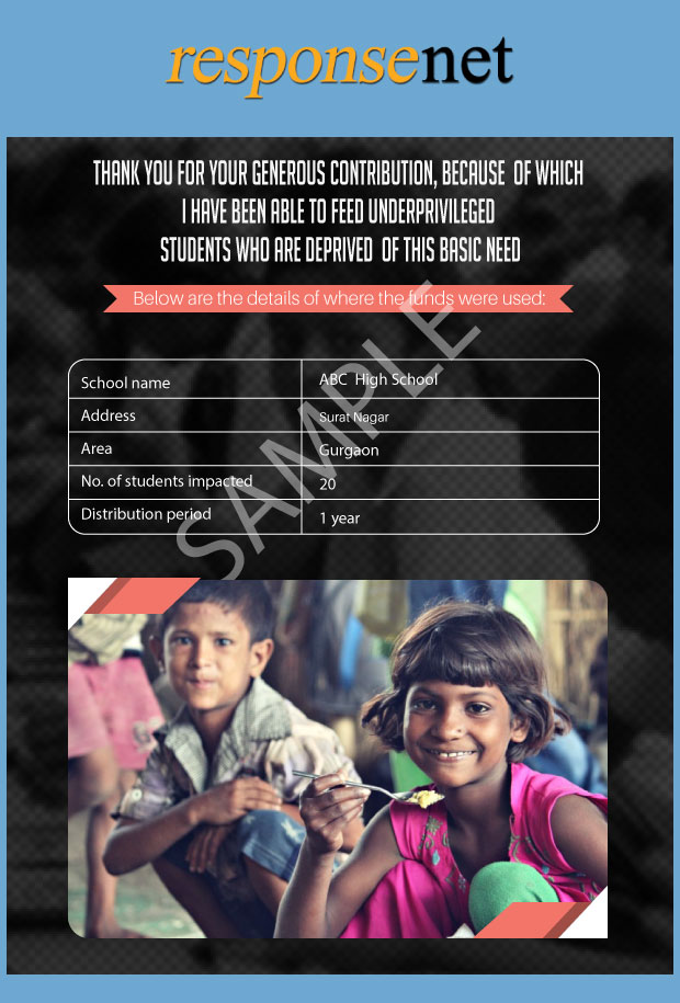 RESPONSENET an NGO based in Delhi (also known as DELHI FOODBANK) has started an initiative to give lunch to children who are mostly off the streets and migrants, lacking access to any formal education in the NCR region. This program helps bridge the learning gap and link them to regular schools. It takes only INR 15 to feed one wholesome meal to a child. These children who are being supported by RESPONSENET in Delhi/NCR region are from Schools, non-formal schools and Creches. The cost per child per annum is INR 4500. (300 meals per annum).