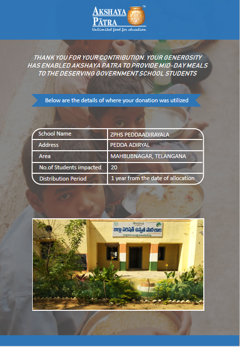 I am doing this campaign to raise awareness and funds for the Akshaya Patra Foundation. Funds raised would be used to provide wholesome school lunch to children at government schools across Telangana in under the Mid-day meal program.