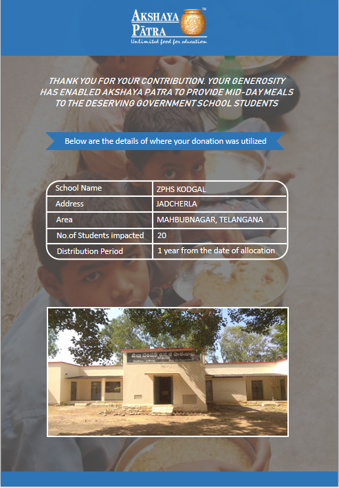 I am doing this campaign to raise awareness and funds for the Akshaya Patra Foundation. Funds raised would be used to provide wholesome school lunch to children at government schools across Telangana in under the Mid-day meal program.